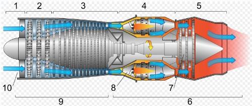 4、动力输出:高温高压的燃气推动涡轮旋转,涡轮的旋转通过传动装置驱动动力涡轮,从而输出动力,这部分动力可以用于驱动飞机的螺旋桨或直升机的旋翼等。