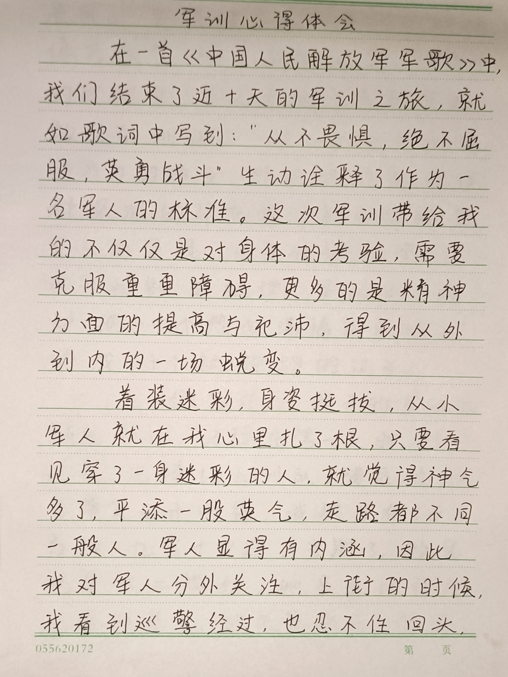 集团军训对我来说是一次很好的自我提升和改进的机会,在训练过程中,我发现自己在体能、意志力和执行力等方面还有待提高,我会因为疲劳和困难而产生放弃的想法,但是通过不断努力和坚持,我最终克服了这些困难,这让我深刻认识到,只有不断挑战自己,才能提高自己的能力和素质。