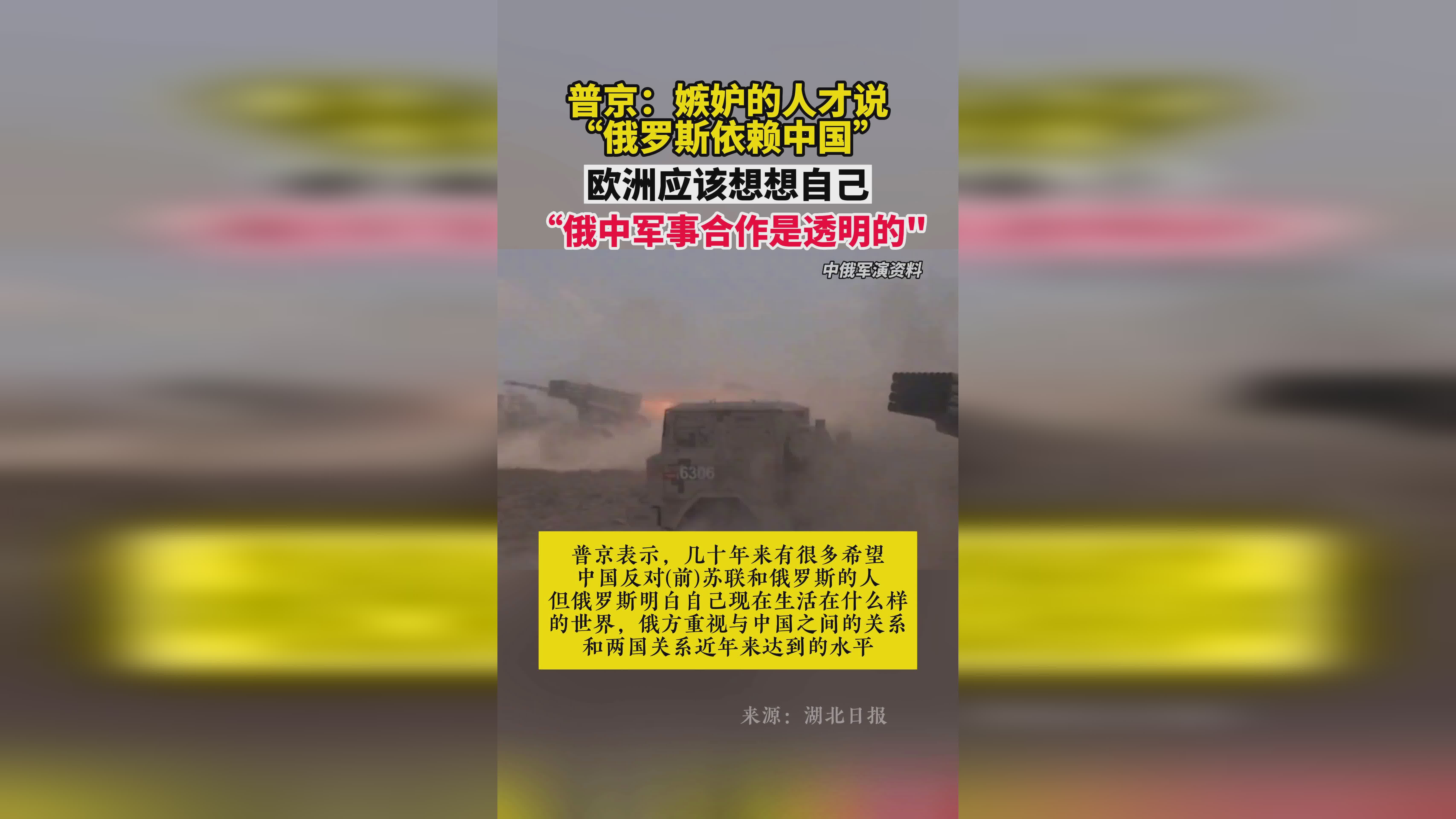 中俄两国在军事和安全领域保持着紧密合作,面对全球安全形势的复杂变化,俄罗斯必须依赖中国,共同应对安全挑战,维护两国及地区的和平与稳定。